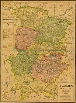 - ↑ A mianowicie: 1. Šakių, 2. Vilkaviškio, 3. Marijampolės, 4. Prienų rajonai, Žilvytis Bernardas Šaknys, Lietuvos Respublikos administracinio teritorinio suskirstymo perspektyvos: etnografiniai kultūriniai regionai, [w:] oficjalna witryna parlamenty Republiki Litewskiej, dostępna tutaj [dostęp 5 lipca 2020].