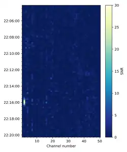 Odbierany sygnał radiowy był zbierany i przetwarzany przez uruchomiony na komputerze IBM 1130 program komputerowy N50CH napisany przez Roberta Dixona i Jerry’ego Ehmana, wolontariuszy przy tych badaniach[8]. Wydruk z IBM 1130 przedstawiał: po lewej stronie kalkulowaną wartość stosunku sygnału do szumu, po prawej informację o rektascensji i deklinacji przeliczonych do epoki B1950.0, podawane w 12-sekundowych interwałach. Lewa strona wydruku prezentowała dane dla poszczególnych 50 kanałów przeliczone wielokrokową formułą mającą oddać część całkowitą oszacowanego stosunku sygnału do szumu; te części całkowite kodowane były na 36-stopniowej, alfanumerycznej skali[7]. Każdy znak lewej strony przedstawiał, dla danego czasu i kanału, stosunek natężenia (lub mocy) odbieranego sygnału (pomniejszony o wartość progową) do średniej kwadratowej natężenia[9]. Taki pomiar wykonywano równocześnie dla poszczególnych kanałów o szerokości 10 kHz[9]; przy czym najpierw w każdym interwale pomiar natężenia trwał 10 sekund i był uśrednieniem 10 pomiarów sekundowych wykonanych dla każdego z 50 kanałów; następnych około dwóch sekund zajmowało przetworzenie i analiza sygnału przez komputer[7]. Otrzymaną wartość, stanowiącą wielokrotność aktualizowanej średniej kwadratowej mocy sygnału (będącej estymatorem odchylenia standardowego) kodowano na ww. alfanumerycznej skali od 0 przez A (10) do Z (35)[7][9].