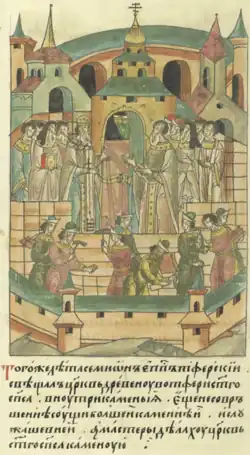 ![]() Biskup twerski Symeon błogosławi kniahinię Ksenię i jej syna Michała (Iluminowany zwód latopisarski) | |