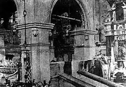 ![]() Wnętrze synagogi - widok na bimę i fotel używany przy uroczystościach obrzezania, przed 1939 | |