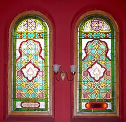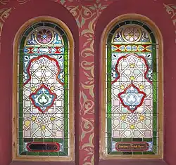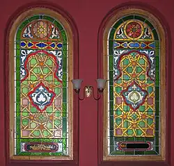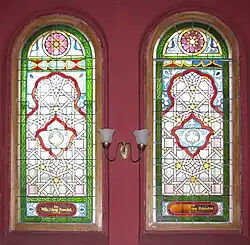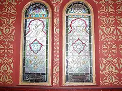 W synagodze znajdują się 43 barwne witraże (20 w sali głównej, 21 na babińcu oraz 2 na klatkach schodowych) o motywach mauretańskich ufundowanych przez członków stowarzyszenia w latach 1894–1909 i 1925 oraz 6 okulusów wypełnionych witrażem z motywem gwiazdy Dawida. Są to jedyne zachowane witraże synagogalne w Polsce. W większości są to kompozycje geometryczno-roślinne. W jednym z witraży wykorzystano kompozycję i motywy fragmentu XVIII-wiecznej polichromii ściennej ze wschodniej ściany drewnianej bożnicy w Jabłonowie[7]. Dwa przedstawiają również Świątynię Jerozolimską w postaci Meczetu na Skale[1]. Tylko w przypadku witraża ufundowanego przez Markusa i Reginę Schönfeldów zachowała się sygnatura wykonawcy: Krakowski Zakład Witrażów i Mozaiki „Żeleński”.