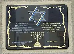 - "W tym miejscu stała synagoga wybudowana w 1885 roku spalona przez hitlerowców 24.11.1939 roku."