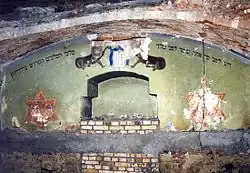 Na ścianie południowej zachowało się XX-wieczne malowidło przedstawiające menorę, gdzie symetrycznie do niej na ścianie północnej znajduje się stół na chleby pokładne opatrzony inskrypcją: „I uczynisz wokoło listwę na cztery palce szeroką i zrobisz wieniec złoty dokoła dla tej listwy” (Wj 25,30). Na tych ścianach w bliskim sąsiedztwie wschodniej znajdują się międzywojenne przedstawienia instrumentów muzycznych[4].