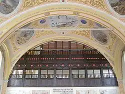 Na spłaszczonym sklepieniu sali głównej zachowało się tondo z dwukrotnym przedstawieniem orła w locie: u dołu nad gniazdem z pisklętami, przy tym inskrypcja: „Jak orzeł, co gniazdo swoje ożywia, nad pisklętami swoimi krąży, rozwija swe skrzydła i bierze je, na sobie samym je nosi” (Pwt 32,11), powyżej z młodymi na skrzydłach, przy tym inskrypcja: "Wyście widzieli, co uczyniłem Egiptowi, jak niosłem was na skrzydłach orlich i przywiodłem was do Mnie" (Wj 19,4)[4]. Na suficie widnieje także Lewiatan połykający własny ogon, będący symbolem czasów mesjańskich. Do niedawna we wschodniej części sklepienia znajdowało się przedstawienie Tory w postaci rozłożonego zwoju. Ta partia malowideł odpadła w ostatnim czasie wraz z tynkiem[4]. Na pozostałej części sklepienia znajduje się przedstawienie nieba, gdzie gwiazda Dawida pełni rolę gwiazdek rozsianych po nim.