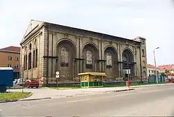 Pomiędzy wieżami znajduje się kolumnowy portyk z trójkondygnacyjną galerią, wspartą na czterech, masywnych, ceglanych kolumnach z korynckimi głowicami. Kondygnacja parteru i pierwszego piętra posiadają wykrój arkad o spłaszczonych łukach. Kondygnacja najwyższa posiada arkady półkoliste, znajdujące się pomiędzy kapitelami kolumn. Masywne balustrady zachowały się w całości. Na szczycie budynku znajduje się dekoracja w kształcie tablic Dekalogu.