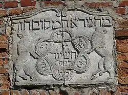 Fasada ujęta jest w czterokolumnowy portyk z trójkątnym tympanonem[2], dawniej na tle schodkowego szczytu przesłaniającego dach. Nad drzwiami głównymi, a poniżej półokrągłego okna znajduje się tabliczka ze stylizowaną gwiazda Dawida, którą podtrzymuje para lwów wkomponowana w hebrajski napis z zaszyfrowaną datą: