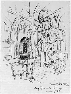 Na wschodniej ścianie pierwotnie znajdował się bogato zdobiony Aron ha-kodesz, który po zakończeniu wojny został zamurowany. Po jego obu stronach stały dwa duże lichtarze. Trzeci, dziewięcioramienny oświetlał stojący opodal pulpit kantora.