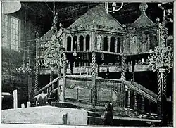 Pośrodku głównej sali modlitw stała wyjątkowo piękna bima, mająca formę ośmiobocznej wieży z oknami i łukami pokrytej misternymi rzeźbieniami w całości przykryta piramidalnymi daszkami, wspartymi na słupkach, połączonych górą arkaturowym fryzem. Dach nad podium ośmioboczny z „latarnią” z tralek i hełmem z wieloboczną, wysoką gałką; nad schodkami daszki czworoboczne z podobnymi gałkami. Fryz nad podium pełny, nad schodkami ażurowy, nad wejściami wycięty w łuk. Balustrada podium pełna, płycinowa. Słupki pomiędzy górą balustrady i poręczami a dołem fryzu wyrzeźbione w spiralę. Wykańczające fryz listwy: dolna z „wolimi oczami” i górna z ząbkowaniem, deska wycięta w koronkę[2].