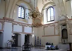 Do obniżonej w stosunku do ulicy, głównej sali modlitewnej, prowadzi oryginalny, kamienny renesansowy portal. W jej wnętrzach, na ścianie wschodniej na środkowym pilastrze zachował się pochodzący z pierwszej połowy XVII wieku, późnorenesansowy kamienny Aron ha-kodesz ujęty w dwie kanelowane kolumny niosące belkowanie z łamanym tympanonem z koroną i kartuszem. Na ścianach i sklepieniach bogata stiukowa i sztukateryjna dekoracja z cennymi rozetami i malowidłami, na których widać inskrypcje w języku hebrajskim oraz wystylizowane Drzewo Życia[2][3].