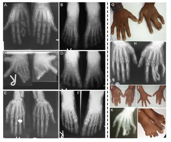 - ↑ Malik S, Girisha KM, Wajid M, Roy AK, Phadke SR, Haque S, Ahmad W, Koch MC, Grzeschik KH. Synpolydactyly and HOXD13 polyalanine repeat: addition of 2 alanine residues is without clinical consequences. „BMC Medical Genetics”. 8. 78, 2007.