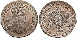 Również bez tytułu prawnego w latach 1753–1756 szóstaki z mennicy lipskiej wypuszczał August III. Dopiero ordynacja z 10 listopada 1760 r. zezwalała na legalna emisję szóstaków o masie 2,936 grama srebra próby 312[3].