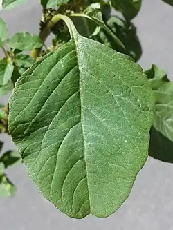 - Ulistnienie nakrzyżległe. Liście długoogonkowe, tępo zakończone z wycięciem na szczycie, w nasadzie zwężające się. Na brzegu drobno ząbkowane. Od spodu połyskujące, a z wierzchu z plamą jaśniejszą lub ciemniejszą od brzegu liścia.