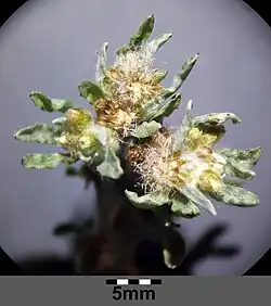 - W drobnych koszyczkach skupionych po 3–10 w liczne główki na szczytach rozgałęzień pędów. Główki te otoczone są dłuższymi od nich liśćmi. Listki okrywy koszyczków wyrastają w 2–3 szeregach, są błoniaste, jasnobrązowe, na brzegu ciemniejsze. Zewnętrzne listki są jajowate, tępe i osiągają 2 mm długości. Wewnętrzne są węższe, dłuższe (do 3 mm) i czasem bywają słabo zaostrzone. Kwiaty w koszyczkach są żółtawobiałe, osiągają do 2 mm długości. Brzeżne kwiaty są nitkowate i żeńskie, środkowe są obupłciowe i rurkowate[5].