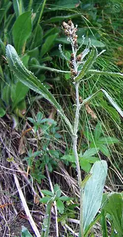 - Roślina zielna z prosto wzniesioną, pojedynczą łodygą bez pędów płonnych u nasady. Pęd (łodyga i liście) są białoszaro, wełnisto owłosione[5].