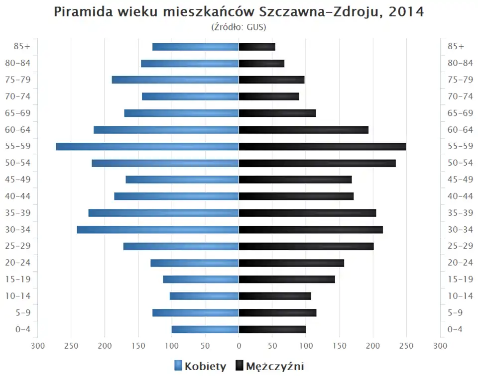 Piramida wieku mieszkańców Szczawna-Zdroju w 2014 roku[27].