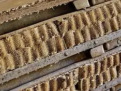 - Brązowe, podłużne, czworoboczne niełupki o wymiarach 4–8 × 1–1,5 mm, podłużnie rowkowane na powierzchni[5][15].