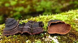 Bardzo cienki, przyrośnięty do drzewa tylko środkową częścią, troszkę dzwonkowaty, odstający od podłoża na odległość do 2 cm, gęsto dachówkowaty; ciemny, czerwonobrązowy z wąskim czarnym pasem[5].