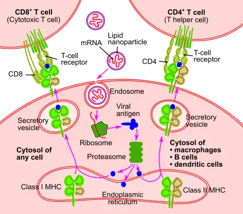 - RNA zawarty w szczepionce (głównie dwuniciowa postać RNA będąca produktem ubocznym) może aktywować wrodzoną odpowiedź immunologiczną organizmu[13][14][15]. Reakcja ta może mieć pozytywne działanie wzmacniające humoralną i komórkową swoistą odpowiedź odpornościową na antygen patogenu, choć może też przynieść niepożądane skutki w postaci reakcji zapalnych związanych z interferonem typu I, indukcji prozapalnych cytokin oraz obniżenia efektywności samej szczepionki, poprzez hamowanie translacji mRNA[15][16][17]. W związku z tym, identyfikacja osób predysponowanych do problemów autoimmunologicznych przed podaniem szczepionki RNA może pozwolić na przyjęcie środków ostrożności[18]. Odpowiednie kroki podjęte podczas produkcji szczepionek (np. poprawiające jakość transkrypcji in vitro, oczyszczanie metodą chromatografii cieczowej) redukują ryzyko niepożądanej immunostymulacji[13][16][14][17][15].