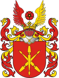 Klejnot - dwa skrzydła orle - prawe czerwone, lewe złote, pośrodku roża czerwona.