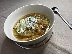- Rodzaju kapusty - występuje wersja bazująca na białej, surowej kapuście, kapuście kiszonej lub smażonej.