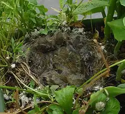 Budowane w koronie drzewa lub wysokiego krzewu (np. jałowca, tui)[13], zwykle na wysokości powyżej 4 m[21]. Jest misternie uwite z gałązek, traw, mchu, korzonków spojonych pajęczynami i wysłane puchem oraz włosiem. Ma kształt grubościennej czarki. Ptaki dobrze je ukrywają. Budową gniazda zajmuje się samica[21].