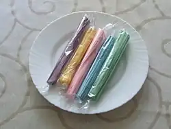 Ma postać laseczki przypominającej szczapę drewna (stąd też pochodzi jego nazwa: „szczypa” – kawałek rozłupanego drewna przesyconego żywicą, służący do rozpalania ognia)[1]. Może mieć różne barwy, dzięki zastosowanym barwnikom i smaki (aromaty itp.)[2].