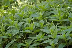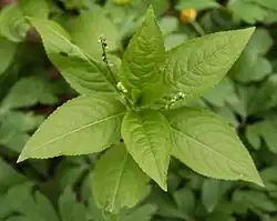 - Asymilacyjne są podługowato-jajowate do eliptycznych (wyższe bardziej wydłużone, dolne szersze), o długości 2–3 razy większej od szerokości (do 14 cm długości i 6 cm szerokości), o zwężonych nasadach, zaostrzonych wierzchołkach oraz karbowano ząbkowanych i orzęsionych brzegach. Ogonki liściowe krótkie – do 1 cm długości na roślinach kwitnących, na płonnych zwykle od 2 do 3 cm długości. Liście są nagie lub przylegająco owłosione i mają niewielkie (długości ok. 2 mm), owalnolancetowate i błoniaste przylistki. Ulistnienie naprzeciwlegle. Na pędzie występuje do 12 par liści asymilacyjnych[5]. W dolnych 2–3 węzłach wyrastają błoniaste liście łuskowate, które niekiedy zrastają się z trójkątnymi przylistkami, tak że wyglądają na trójklapowe. Liście u roślin męskich są rozmieszczone bardziej równomiernie, u żeńskich są wyraźnie skupione w górnej części pędu[8][9]. Liście ciemnozielone o niebieskawym połysku[10].