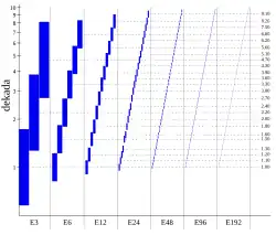 Szeregi wartości w elektronice stosowane dla oznaczeń rezystancji oporników i pojemności kondensatorów oznaczane są skrótowo literą E oraz liczbą, wskazującą liczbę wartości tabelarycznych w pojedynczej dekadzie (tzn. w zakresie od 1 do 10, albo 10 do 100, albo 100 do 1000 jednostek: omów, kiloomów, megaomów, pikofaradów, nanofaradów lub mikrofaradów). I tak szereg E3 zawiera tylko trzy takie wartości (10, 22 i 47), E6 – sześć (10, 15, 22, 33, 47, 68) itd. Dzięki takiemu logarytmicznemu podziałowi udało się uzyskać pokrycie całych dekad potrzebnych wartości – w zależności od dopuszczalnej tolerancji – stosunkowo niewielką ilością standardowych wartości nominalnych. Dla dopuszczalnej tolerancji 50% wystarczą (w przybliżeniu) trzy takie wartości, i dlatego używany jest szereg E3. Jeżeli bowiem projektant przewidział konieczność użycia opornika w klasie tolerancji 50% i w zakresie od 5 do 15 omów (10 ±50%), to można użyć wartości 10 z szeregu E3, natomiast dla wartości od 11 do 33 można użyć 22 ±50%, wreszcie od 34 do 70 – 47 ±50%. Dla wyższych nominałów stosowane są wartości z kolejnej dekady: od 50 do 150 – 100 ±50%, od 110 do 330 – 220 ±50% itd.