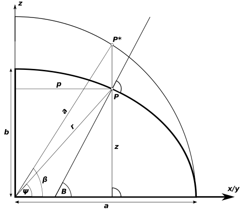 Szerokość geocentryczna – kąt jaki tworzy promień wodzący punktu P znajdującego się na powierzchni elipsoidy z płaszczyzną równika.