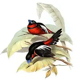 - ↑ W języku angielskim nosi on bardziej odpowiednią do jego upierzenia nazwę szerokodzioba czarno-czerwonego.