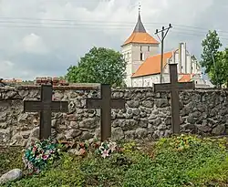 Gotycki kościół wybudowany został w drugiej połowie XV w. Świątynia została zniszczona w wyniku pożar]u w 1618 r., a następnie odbudowywana w okresie do 1639. Przypuszcza się, że kościół mógł mieć jeszcze jedną nawę lub trójprzęsłową galerię otwartą do nawy, świadczą o tym zamurowane arkady w ścianie południowej.