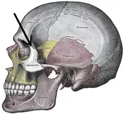 U człowieka łączy wyrostek jarzmowy kości czołowej z wyrostkiem czołowym kości jarzmowej[2].
