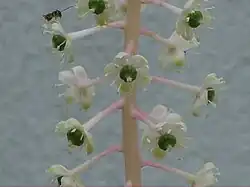 - Drobne, białe, zielonkawe lub różowawe i zebrane w gęste kłosy o długości do 15 cm. Talerzykowate kwiaty wyrastają na krótkich szypułkach i składają się z pięciu owalnych i podgiętych w górę działek kielicha, dziesięciu pręcików o dużych pylnikach i jednego rozdętego, zielonego słupka. Korony brak.