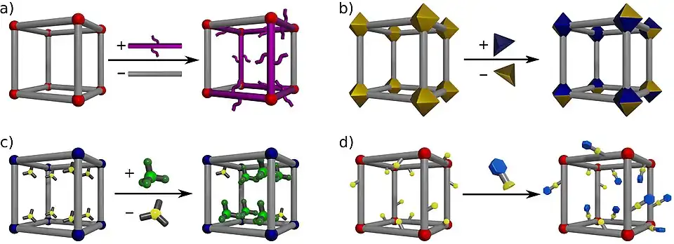 Linkery budujące MOF-y mogą zostać zamienione na inne, o ile charakteryzują się podobną budową, czyli mają te same grupy funkcyjne koordynujące do klastrów metali oraz podobną długość. Jako przykład można podać wymianę linkerów aminotereftalowych i bromotereftalowych w MOF-ach z rodziny UiO-66[21]. Całkowita wymiana jednych linkerów na inne jest możliwa, jednak wymaga użycia do reakcji znacznych nadmiarów drugiego linkera[22][23]. Znane są nieliczne przykłady wymiany linkerów na znacznie dłuższe w MOF-ach o budowie warstwowej[24].