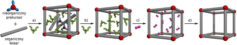 Synteza szkieletów metalo-organicznych polega na samoorganizacji nieorganicznych klastrów i organicznych linkerów, które za pomocą mocnych wiązań koordynacyjnych tworzą krystaliczny polimer koordynacyjny. Żeby taka samoorganizacja była możliwa, konieczne jest zapewnienie warunków, w których wiązania klastrów z ligandami mogą się nie tylko tworzyć, ale i rozpadać, co osiąga się dostarczając do układu energię na przykład w postaci ciepła, energii mechanicznej, promieniowania i innych. W takich warunkach możliwa jest korekcja błędów i otrzymanie struktur o wysokim stopniu krystaliczności[17].