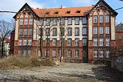 ![]() Budynek szkoły gminnej (w centrum fontanna, a po lewej fragment dawnej łaźni) | |