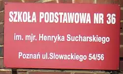 - tablica Westerplatte 1-7 IX 1939 o treści: Szkoła podstawowa nr 36 im. Majora Henryka Sucharskiego w Poznaniu z płaskorzeźbionym wizerunkiem Sucharskiego,