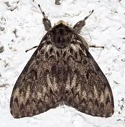 - Orgyia antiqua L. – znamionówka tarniówka, larwa ogryza igły i liście (liściaste i iglaste).