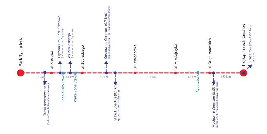 Milowice, okolice ul. Baczyńskiego 25b (okolice Hali Sportowej) – Park Tysiąclecia, – most nad S86 – wał rzeki Brynicy wzdłuż ul. Kresowej i ośrodka Stawiki – przecięcie z ul. Sobieskiego – za osiedlem Naftowa wzdłuż wału powodziowego rzeki Brynicy – przecięcie z ul. Ostrogórską – tereny leśne wzdłuż oczyszczalni ścieków Radocha II – ul. Mikołajczyka – tereny leśne – ośrodek Rybaczówka – ul. Rynek – ul. Pastewna – wzdłuż Przemszy – Trójkąt Trzech Cesarzy[3]