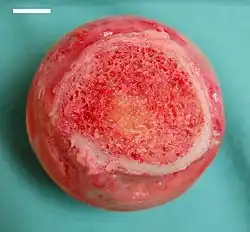 Przekrój przez głowę kości udowej, peryferyjnie widoczny szpik kostny czerwony, centralnie widoczny szpik kostny żółty