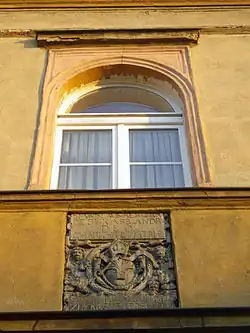 Nad wejściem od strony zachodniej umieszczono tablicę fundacyjną z łacińskim napisem:
