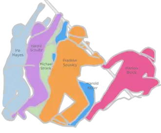 Ira Hayes, Harold Schultz, Michael Strank (†), Franklin Sousley (†), Rene Gagnon oraz Harlon Block (†)