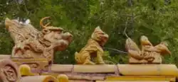 Charakterystycznym elementem chińskich budynków jest dach, wsparty za pośrednictwem wsporników na słupkach bez kapiteli, powiązanych poziomą poprzeczką. Dach odgrywa rolę dekoracyjną. Początkowo był ciężki i masywny. Za panowania dynastii Song wsporniki stają się delikatniejsze, a dach zostaje mocniej wysunięty przed lico budynku. W budowlach reprezentacyjnych dach jest rozbudowany w wielopiętrowe, ażurowe konstrukcje. Na południu Chin zaczęto podciągać naroża dachu ku górze, uzyskując linię porównywaną przez Chińczyków do skrzydeł lecących ptaków. (Dachy północnych prowincji chińskich nie miały tak silnie zaakcentowanego tego elementu.) Pokrycie dachu wykonywano z ceramicznych, półkolistych dachówek w kształcie zbliżonym do gąsiorów. Kolor dachówki był zróżnicowany: złotożółty rezerwowano dla budowli pałacowych, niebieski dla budowli sakralnych, a szary dla budynków mieszkalnych. Na kalenicach stawiano kolorowe ceramiczne figury smoków i innych symbolicznych zwierząt, a wsporniki podtrzymujące dach obijano złotą blachą, zdobiono je polichromią w barwach błękitnym, zielonym i białym.