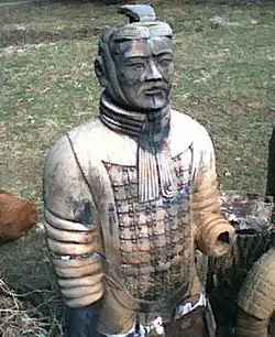 Największym odkryciem archeologicznym związanym z czasami panowania dynastii Qin było znalezienie w 1974 r. w pobliżu grobowca Pierwszego Cesarza komory grobowej, w której ustawiono w szyku bojowym grupę ceramicznych postaci. W sumie, w trzech komorach odkryto grupę liczącą ok. 8 tysięcy rzeźb naturalnej i ponadnaturalnej wielkości. W grobowcu znaleziono postacie żołnierzy i urzędników, a także koni i wozów. Orszak terakotowego wojska w pełnym uzbrojeniu, złożony z postaci o indywidualnych rysach twarzy, w różnych pozach, towarzyszył w drodze w zaświaty cesarzowi. Rzeźby pierwotnie były pomalowane. Oprócz figur wykonanych z gliny, na obszarze w pobliżu grobowca znaleziono także przedmioty wykonane z brązu: wozy, rydwany, broń itp. Grobowca cesarza jeszcze nie odkopano. (Zespół grobowców wraz z terakotową armią został wpisany na światową listę dziedzictwa kulturowego UNESCO w 1987). Z osobą tego władcy związane są też: edykt nakazujący spalenie ksiąg i prześladowanie konfucjanizmu, reforma pisma, ujednolicenie systemu miar i wag oraz rozpoczęcie budowy Wielkiego Muru, którego budowa była kontynuowana z licznymi przerwami przez kolejne pokolenia.