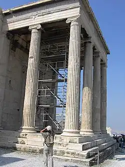 Podobne rozwiązania zastosowano w zbudowanej w latach (445–425 p.n.e.) świątyni poświęconej Atenie i Hefajstosowi, zwanej Tezejonem (od dekoracji metop ukazującej czyny Tezeusza). Przy budowie jońskiego Erechtejonu (421-406 p.n.e.) zastosowano w południowym portyku kariatydy zamiast kolumn. Rozwiązanie tej świątyni, złożonej z trzech połączonych ze sobą obiektów, rozplanowanych na terenie o zróżnicowanej wysokości, uważane jest za wzór doskonałości zastosowania porządku jońskiego[16]. W doryckich Propylejach (437-432 p.n.e.) przy budowie wewnętrznej kolumnady zastosowano porządek joński[17].