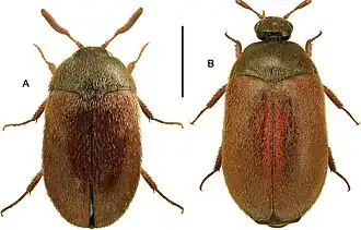 Całe ciało imago pokryte złocistożółtymi włoskami. Głowa i przedplecze zwykle czarne lub brunatnoczarne, rzadziej brązowe. Pokrywy brązowe lub czerwonawe. Czułki i nogi brązowe. Widoczny dymorfizm płciowy. Samice większe od samców, mierzą ok. 4 mm długości, gdy samce 2,5 mm. Ponadto, buławki czułków samców znacznie dłuższe niż te u samic.[2]