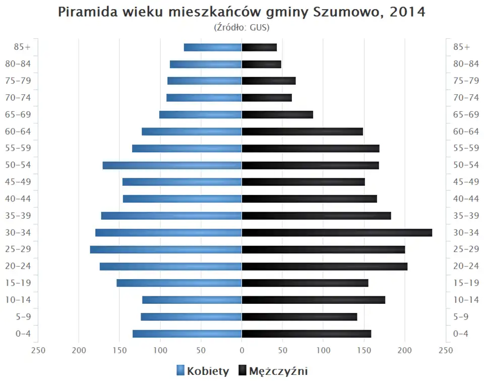 - Piramida wieku mieszkańców gminy Szumowo w 2014 roku[1].