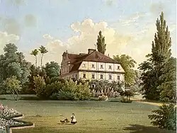 - dwór (nr rej.: 3133 z 10.08.1979). Zbudowany w 1797 roku na surowym korzeniu przez Marie Sophie Braun. W XIX wieku rycina dworu została umieszczona w szóstym tomie albumu Aleksandra Duncknera, co spowodowało, że stał się znany. Początkowo o wystroju barokowym, przebudowywany wielokrotnie uzyskał wystrój klasycystyczny. Podczas remontu usunięto prostokątne płyciny umieszczone dawniej nad i pod oknami oraz zmieniono formę wieńczącego szczytu. Na belkowaniu, którego podstawę stanowił gzyms, były wygięte spływy szczytu wieńczonego, przerwanego gzymsem z półkolistym zamknięciem. Przez całą wysokość szczytu biegły dwie lizeny, flankujące usytuowane pośrodku i przesklepione pełnym łukiem okno oraz umieszczony nad nim okulus. Całości dopełniały ozdobne wazy, ustawione symetrycznie na krawędziach gzymsów.