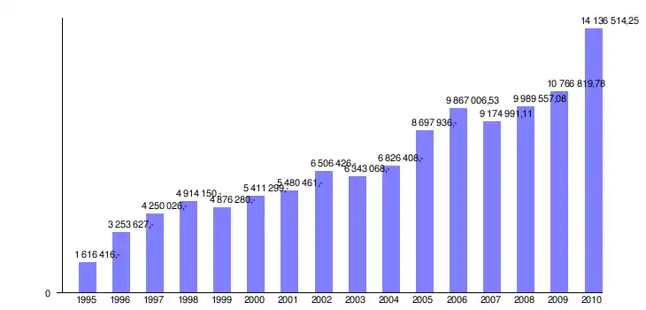 Rysunek 1.2 Wydatki ogółem w Gminie Szydłów w latach 1995-2010 (w zł)[9]