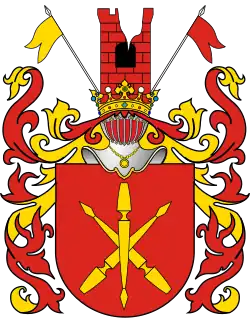 Klejnot - wieża czerwone, częściowo zniszczona, między dwiema chorągewkami - z prawej w skos, złota, z lewej w skos lewy, czerwona.